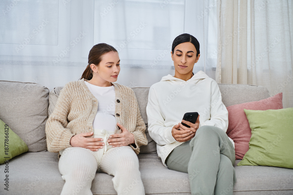 Expectant mom and coach share moments of joy and connection while relaxing together indoors