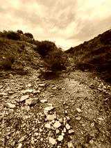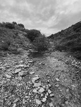 River canyon with rocks, pebbles, trees and vegetation under grey cloudy sky. Andalusia, Spain.