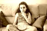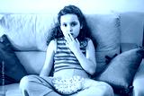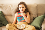Little cute girl kid watching TV movie on sofa in the living room with popcorn