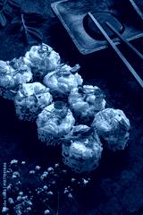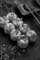 Premium salmon sushi rolls topped with creamy salmon tartare and microgreens, served with soy sauce and chopsticks on a dark elegant background. Luxury Japanese maki, gourmet seafood fusion