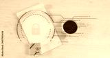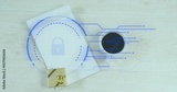Displaying closed white notebook bearing blue lock overlay on light wood desk, gold gift and coffee
