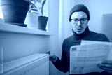 Man with shocked, worried expression holding a utility bill while touching a cold radiator, illustrating rising heating costs, energy crisis and winter household financial strain