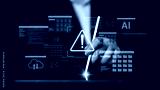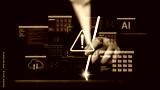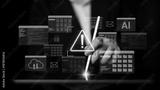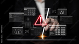 A warning sign indicating potential cyber threats is showcased with a hand holding a stylus against a digital interface displaying various data graphics and security icons. Gantry