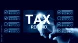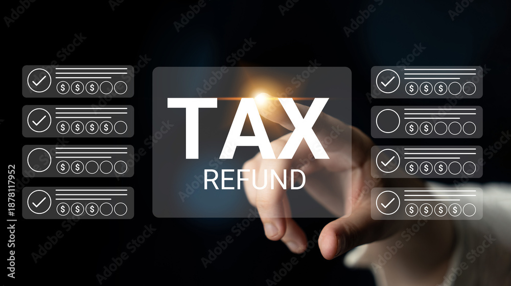 Conceptual image depicting a hand reaching for a tax refund, illustrating financial relief through modern technology and organized paperwork. Perfect for financial themes. Gantry