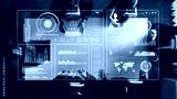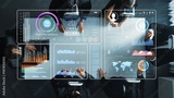 A professional business meeting featuring a team analyzing digital dashboards and data visualizations, highlighting modern technology and teamwork in a collaborative setting. Raster