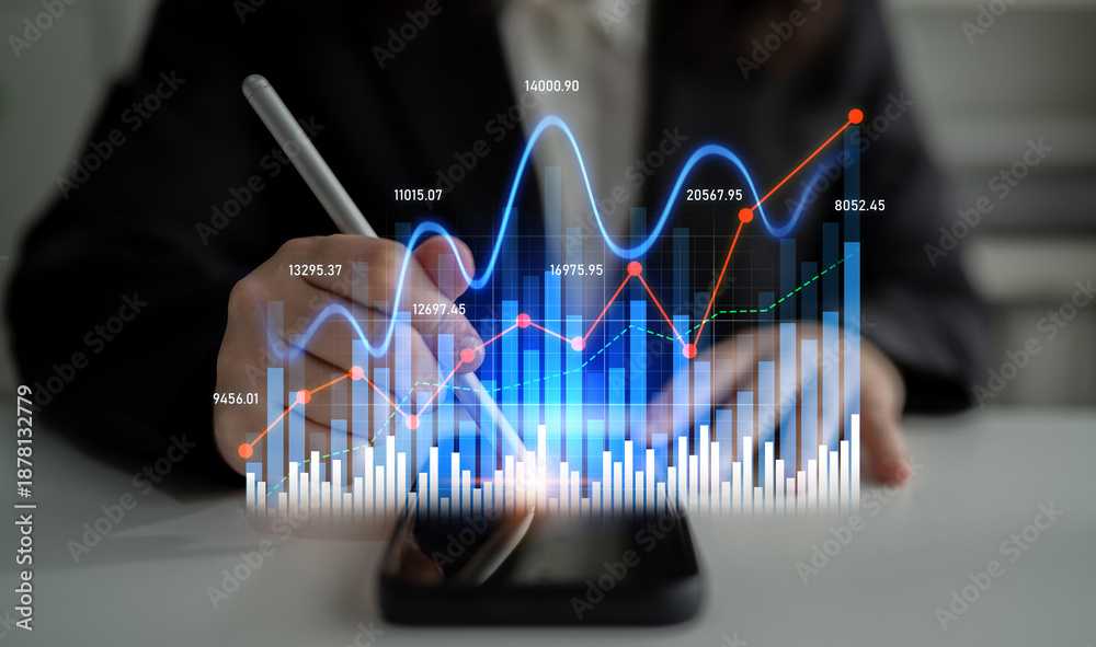 A business professional engages with financial data on a smartphone while analyzing market trends through dynamic digital charts and graphs for strategic growth. Scalp