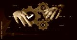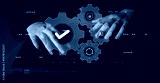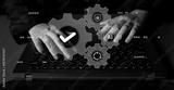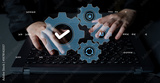 An image showcasing hands typing on a laptop keyboard with digital gears and symbols above, representing technology, artificial intelligence, and innovation in a modern workspace. Gantry