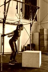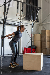 Fitness woman doing box jump workout at cross fit gym