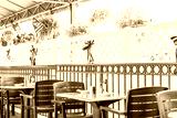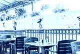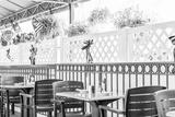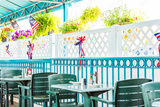 Empty seaside seafood outdoor, outside restaurant tables with summer plants, American flags and nobody