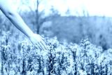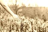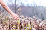 Young woman's bare arm skin hand touching wild fluffy flower leaves dry bushes in autumn fall on hike in Dolly Sods, West Virginia