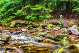 Red creek in Dolly Sods, West Virginia during autumn, fall with green pine tree forest and smooth water river, fallen leaves on rocks, stones