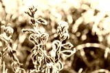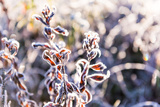 Macro colorful red blueberry bushes in autumn fall showing detail, texture and pattern with frost snow sunrise dawn in West Virginia