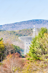 Closeup of Green Bank Radio Telescope in West Virginia with autumn fall forest foliage