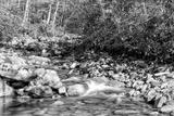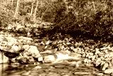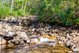 Closeup of shallow rock stream with silky smooth running water and waterfall in autumn with green leaf foliage, stones and long exposure flowing creek