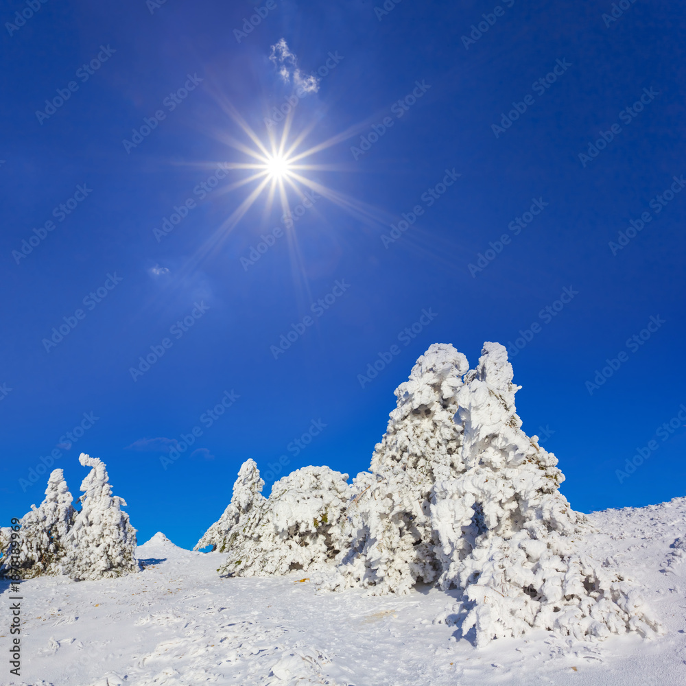 closeup fir tree in snow on hill slope under a sparkle sun