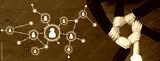 This image illustrates the concept of networking and teamwork through hands joining together, connected by icons representing people on a wooden background, symbolizing collaboration. Amity