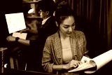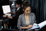 Businesswoman with stressful face looking document paperwork file while coworker trading stock market at back at over late night time at modern office, working on startup company project. Infobahn.