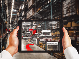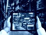 Smart warehouse management system using augmented reality technology to identify package picking and delivery . Future concept of supply chain and logistic business .
