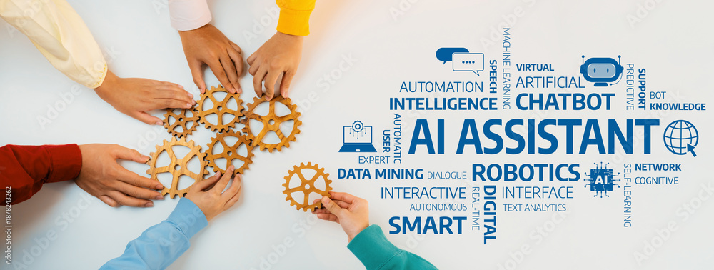 A dynamic team collaborates on artificial intelligence and robotics using gear icons representing innovation and technology, showcasing synergy and collective effort. Amity