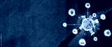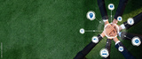 Aerial view of diverse hands uniting on a green grass surface, surrounded by digital icons symbolizing innovation, creativity, and teamwork in a modern professional context. Amity