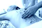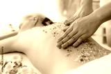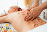 Closeup woman customer having exfoliation treatment in luxury spa salon with warmth candle light ambient. Salt scrub beauty treatment in health spa body scrub. Quiescent
