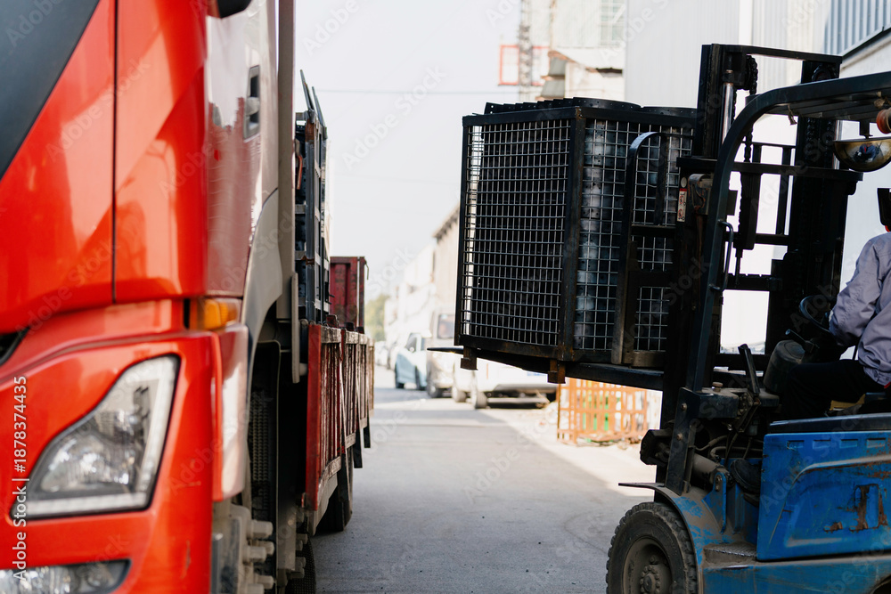 The workers are loading the truck with a forklift.