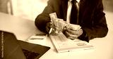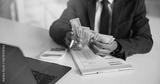 Hands, person and calculate money in office for accounting, audit process and finance checklist. Accountant, cash and laptop with clipboard for tracking expenses, financial management and budgeting