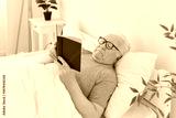 Portrait of gray-haired senior elderly man in eyeglasses reading a book lying on bed in his bedroom at home. Retired confident person enjoying weekend leisure with literature in the morning.
