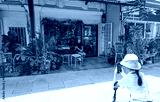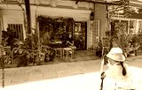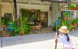 Tourist photographing young woman sitting outside cafe in old town