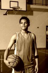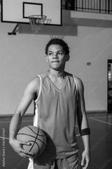 Teenage boy wearing wristband standing on court holding basketball by line near backboard hoop