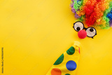 Clown costume elements on yellow background with copy space