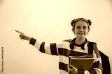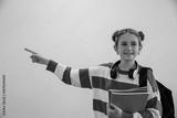 Girl posing in studio pointing left in sweater, backpack, notebooks and headphones, copy space