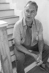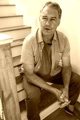 Senior man sitting on wooden staircase inside home with banister wearing light blue shirt