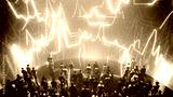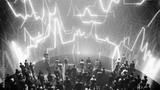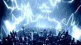 Crowd of business people watching financial data charts and graphs on a large screen