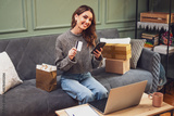 Sitting comfortably on a sofa, woman shows her credit card while using her smartphone for online shopping.
