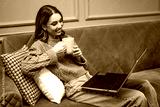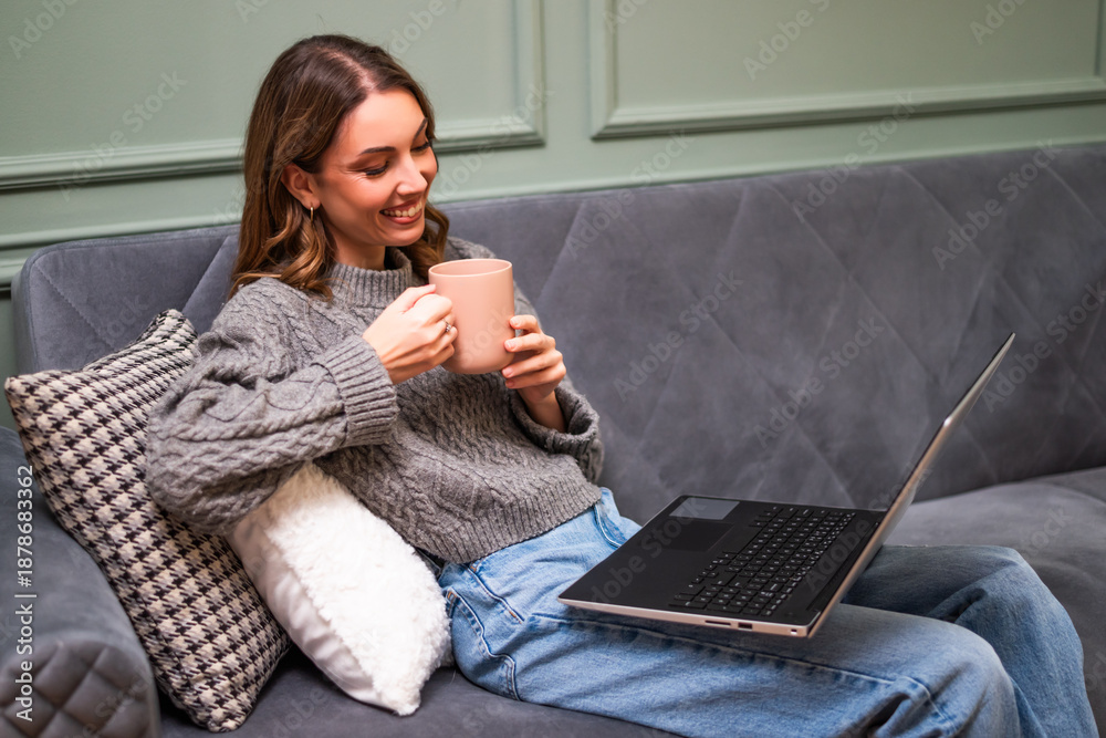 A smiling woman relaxes on a sofa with a warm drink in hand, working on her laptop.