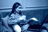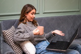 A pensive woman relaxes on a sofa with a warm drink in hand, working on her laptop.