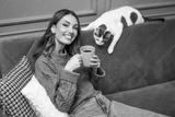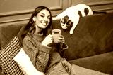 Happy adult woman is enjoying relaxing time at home. She is sitting at sofa and drinking coffee, while cat is lying beside her.
