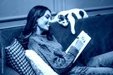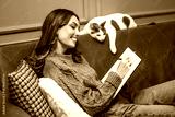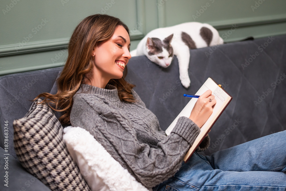 Cheerful cozy dressed woman sitting on sofa and writing diary. Her cat is lying beside her.