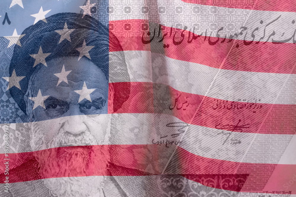 Ruhollah Khomeini Ayatollah Khomeini close up portrait on 100000 Rials Iran banknotes Iran currency with United States of America flag