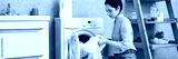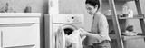 Young woman tidying her modern apartment with a focus on laundry tasks