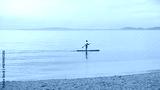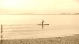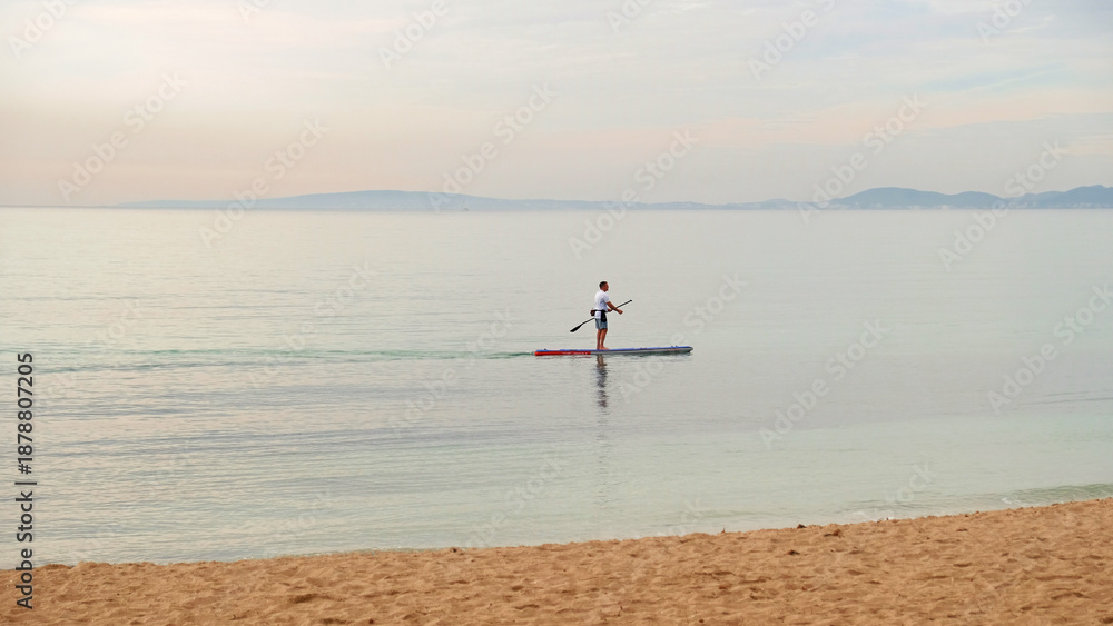 Man paddleboarding alone on calm sea. Soft pastel horizon. Concept of freedom, balance, mindfulness and healthy coastal lifestyle.