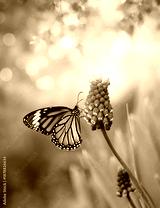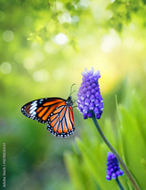 Macro shot of a Monarch butterfly on a purple Muscari flower in a sunny spring garden. A vibrant and beautiful nature scene with a soft green bokeh background.
