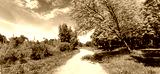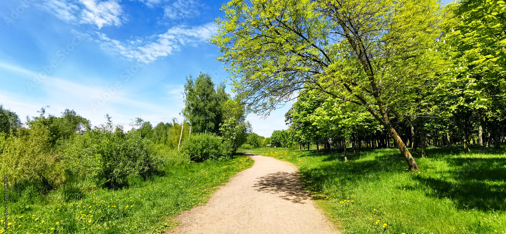 Panoramic view of a winding dirt path in a lush green spring park with a leaning tree. A bright and peaceful nature scene under a blue sky with soft clouds.