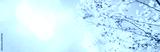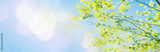 Panoramic view of young green birch leaves on branches against a bright blue sky with sun flare. A fresh and airy nature background capturing the essence of spring.