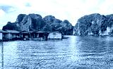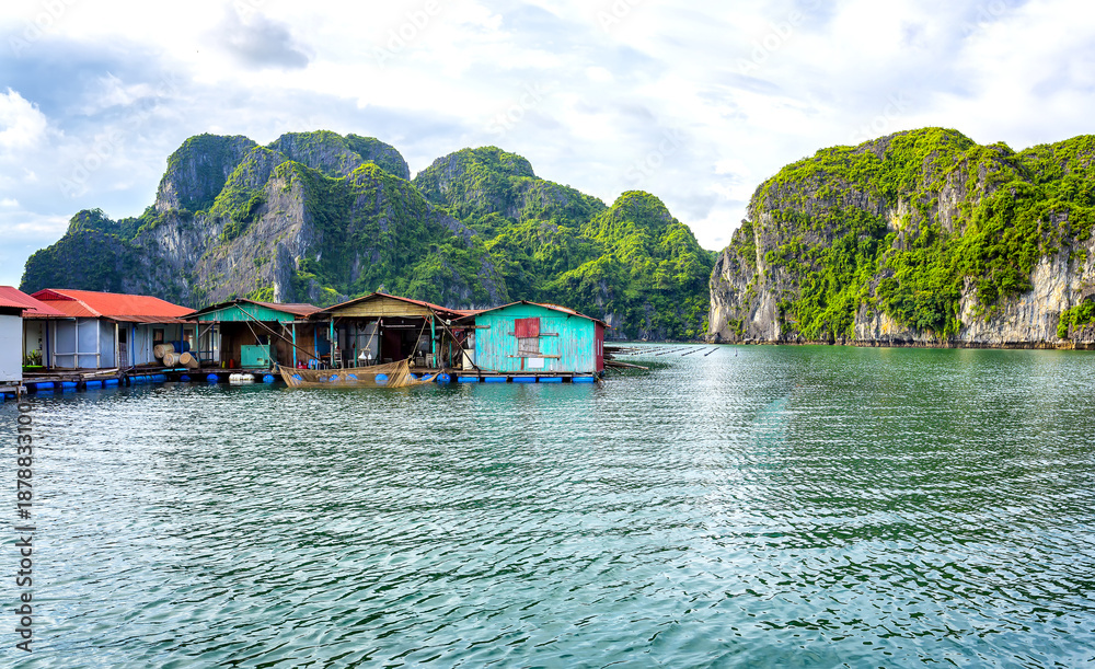 Traditional floating houses, fishing village, anchored against the dramatic limestone karsts of Ha Long Bay