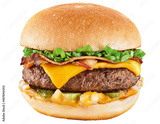 hambúrguer de carne bovina grelhado acompanhado de alface, queijo cheddar, bacon, picles e molho isolado em fundo transparente