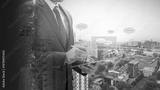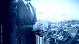 Professional businessman in a suit using a digital tablet for customer feedback, featuring speech bubble icons and a double exposure cityscape background for modern business concepts