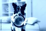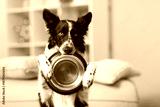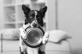 Cute Border Collie dog with feeding bowl indoors, closeup