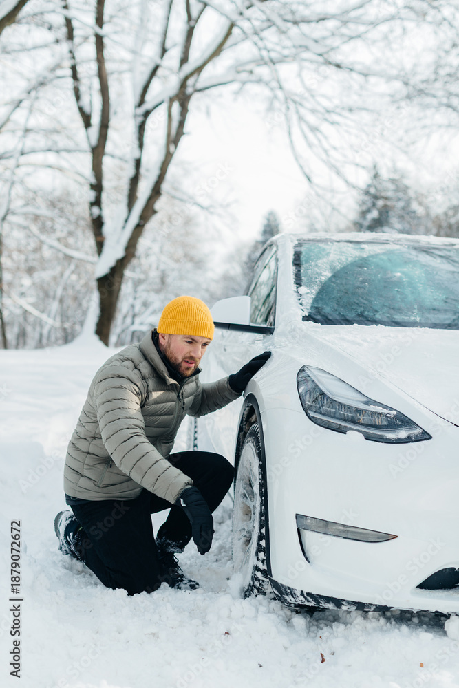 Man inspecting electric car in deep winter snow